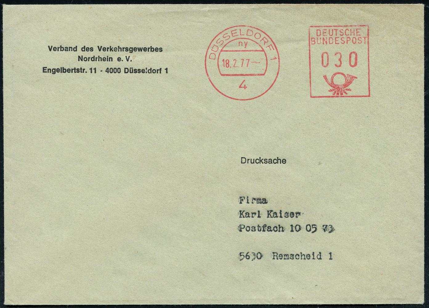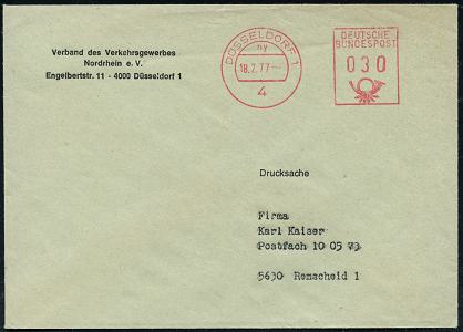 6382 | 8 € | 4000 Düsseldorf Post-Freistempel : 4 DÜSSELDORF 1/ ny/ DEUTSCHE/ BUNDESPOST 1977 (18.2.) PFS "Posthorn" ohne Uhrzeit 030 Pf. mit UB "ny" , Dienst-Bf.: Verband des Verkehrsgewerbes Nordrhein.. (Dü.D-17) | ![]() | |