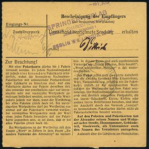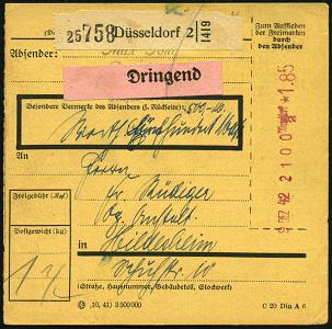 6364 | 25 € | 4000 Düsseldorf Post-Freistempel : Düsseldorf/ 2 1942 (Dez.) Anker-Registrierkassen-FS *1.85 RM + NS-Prägeadler horizontal + schw. Paketzettel: Düsseldorf 2 + rosa Label: Dringend, Inl.-Eil-Paketkarte n. Hildesheim (Dü.H-1A / 2) | ![]() | |