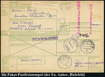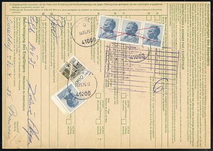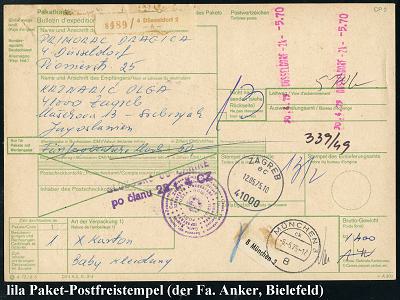 6381 | 18 € | 4000 Düsseldorf Post-Freistempel : DÜSSELDORF -2k- 1975 (30.4.) lila Registrierkassen-Paket-FS - 5.70 (DM einzeilig) 2x + brauner Paketzettel: 4 Düsseldorf 2/ - A - + Leitzettel (München) etc. Ausl.-Paketkt. n. Zagreb, rs. jugoslaw. Gebührenmarken (Dü.H-1B) | ![]() ![]() | |