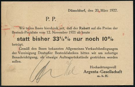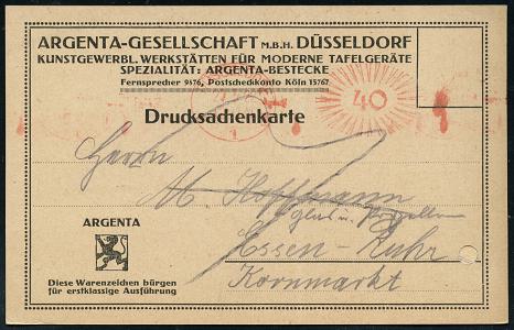 6337 | 15 € | 4000 Düsseldorf Post-Freistempel : DÜSSELDORF/ * 1 II 1921 (27.3.) roter Ziermuster-PFS 40 Pf. auf Reklame-Kt.: ARGENTA-GESELLSCHAFT KUNSTGEWERBL. WERKSTÄTTEN FÜR MODERNE TAFELGERÄTE.. (1x Reg.-Loch geschl.) rs. Text über infla-bedingter Rabatt-Reduzierung (Dü.D-1, Nr.10) | ![]() ![]() | |