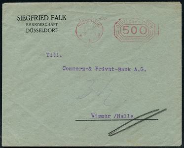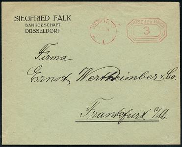 6349 | 8 € | 4000 Düsseldorf Post-Freistempel : DÜSSELDORF/ *1I/ DEUTSCHES REICH 1924 (17.5.) PFS "Achteck" 3 Pf. auf Firmen-Bf.: SIEGFRIED FALK, BANKGESCHÄFT.. (Dü.D-4) | ![]() | |