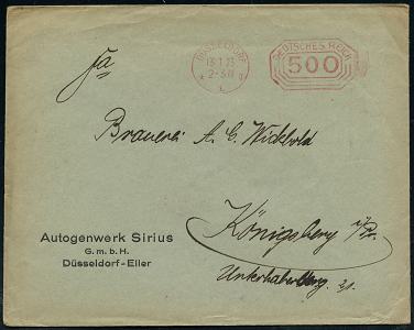 6343 | 12 € | 4000 Düsseldorf Post-Freistempel : DÜSSELDORF/ *1II/ DEUTSCHES REICH 1923 (13.1.) PFS "Achteck" 500 (Mark) auf Firmen-Bf.: Autogenwerk Sirius GmbH.. (Dü.D-3, Nr.36) | ![]() | |