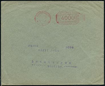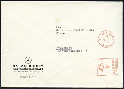 6374 | 8 € | 4000 Düsseldorf Post-Freistempel : (22a) DÜSSELDORF 1/ q/ DEUTSCHE/ BUNDESPOST 1952 (6.9.) PFS "Posthorn" 4 Pf. auf Firmen-Bf.: DAIMLER-BENZ AG.. (Dü.D-17) | ![]() | |