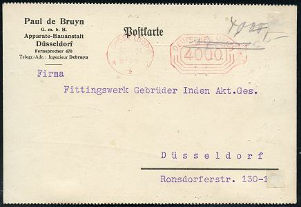 6345 | 12 € | 4000 Düsseldorf Post-Freistempel : DÜSSELDORF/ *1II/ DEUTSCHES REICH 1923 (30.8.) PFS "Achteck" 4000 (Mark) auf Firmen-Kt.: Paul de Bruyn GmbH, Apparate-Bauanstalt.. (Reg.-Lochung geschl.) Orts-Kt. (Dü.D-3, Nr.83) | ![]() | |