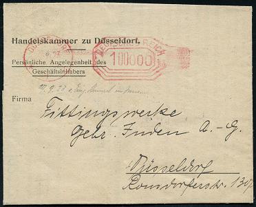 6347 | 18 € | 4000 Düsseldorf Post-Freistempel : DÜSSELDORF/ *1I/ DEUTSCHES REICH 1923 (13.9.) PFS "Achteck" 100ooo (Mark) mit 2 verschiedenen Nullen auf Dienst-Falt-Bf.: Handelskammer zu Düsseldorf (innen Ausriß) Inhalt: Handelskammerbeitrag 1923-24 uber 215.000.000.- Mark, rs. Paper-Siegel-Oblate (Dü.D-3, Nr.107) | ![]() ![]() | |