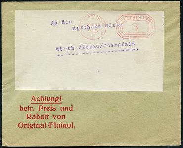 6355 | 8 € | 4000 Düsseldorf Post-Freistempel : DÜSSELDORF/ *1II/ DEUTSCHES REICH 1927 (30.7.) PFS "Achteck" 3 Pf. auf Firmen-Bf.: ... Original-Fluminol (Dü.D-4) | ![]() ![]() | |