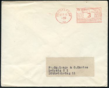 6363 | 10 € | 4000 Düsseldorf Post-Freistempel : DÜSSELDORF/ kp/ Deutsches/ Reich 1941 (18.8.) PFS "Hakenkreuz/Adlerkopf" 3 Pf. klar auf Inl.-Drs.-Bf. (Dü.D-6) | ![]() | |