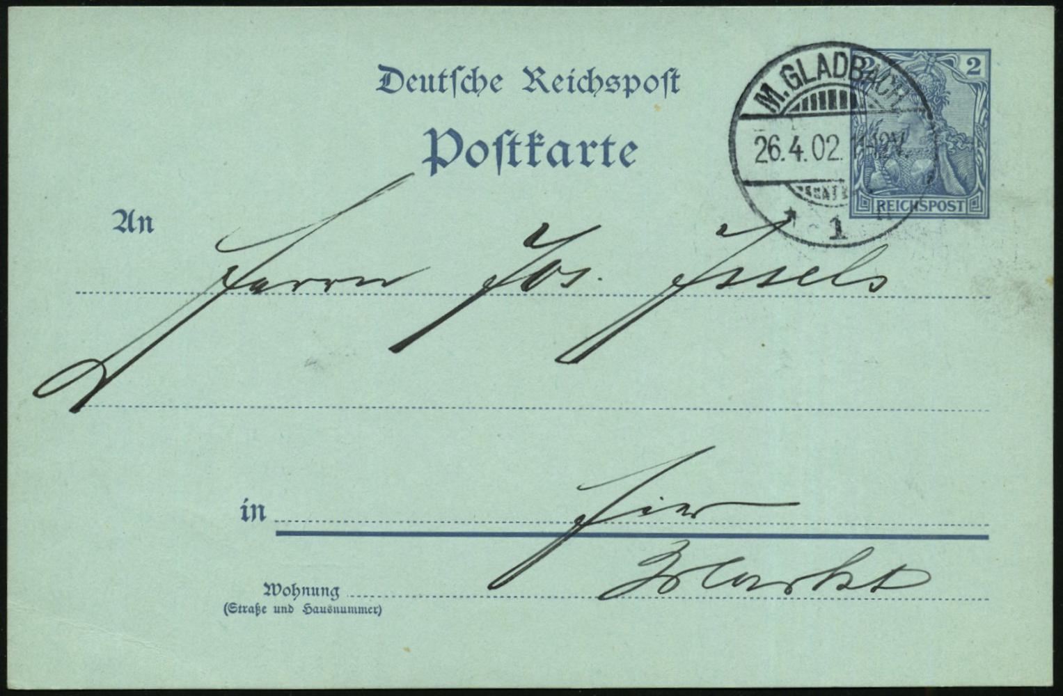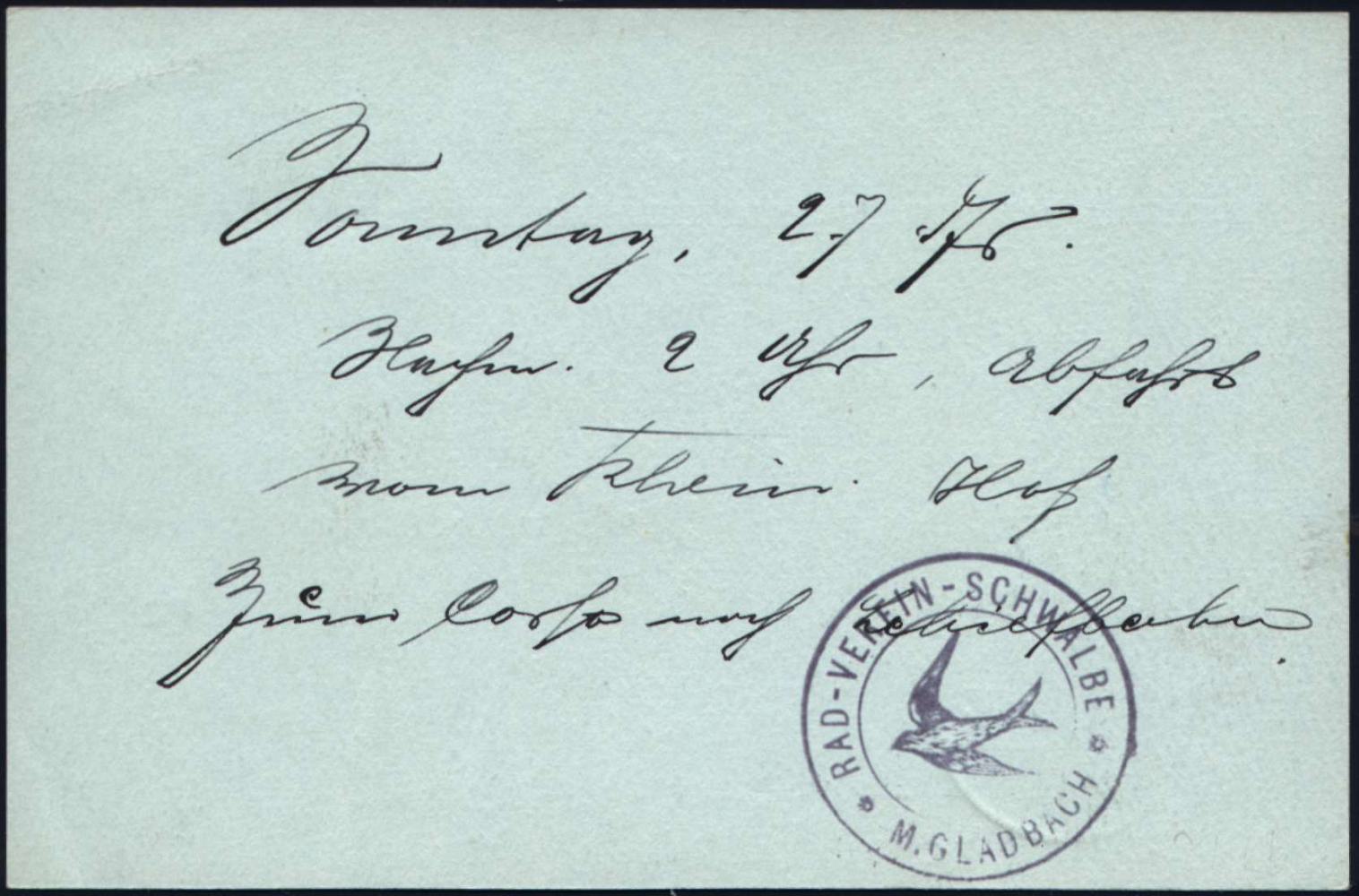 6710 | 25 € | 4050 Mönchengladbach : M.GLADBACH/ *1n 1902 (26.4.) 1K-Gitter auf Orts-P 2 Pf. Germania, rs. viol. 2K-HdN: RAD-VEREIN-SCHWALBE/M.GLADBACH = Schwalbe , klar gest. Orts-Einladungskt. für Sonntags-Radfahrt (Mi.P 63 X) | ![]() ![]() | |