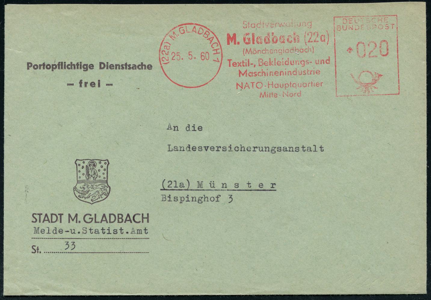 6751 | 12 € | 4050 Mönchengladbach : (22a) MÖNCHENGLADBACH 1/ Stadtverwaltung/ ..NATO-HAUPTQUARTIER/ Mitte-Nord 1960 (25.5.) AFS Francotyp klar auf kommunalem Dienst-Bf. mit Stadtwappen (Dü.E-23DO mit Raute) | ![]() | |