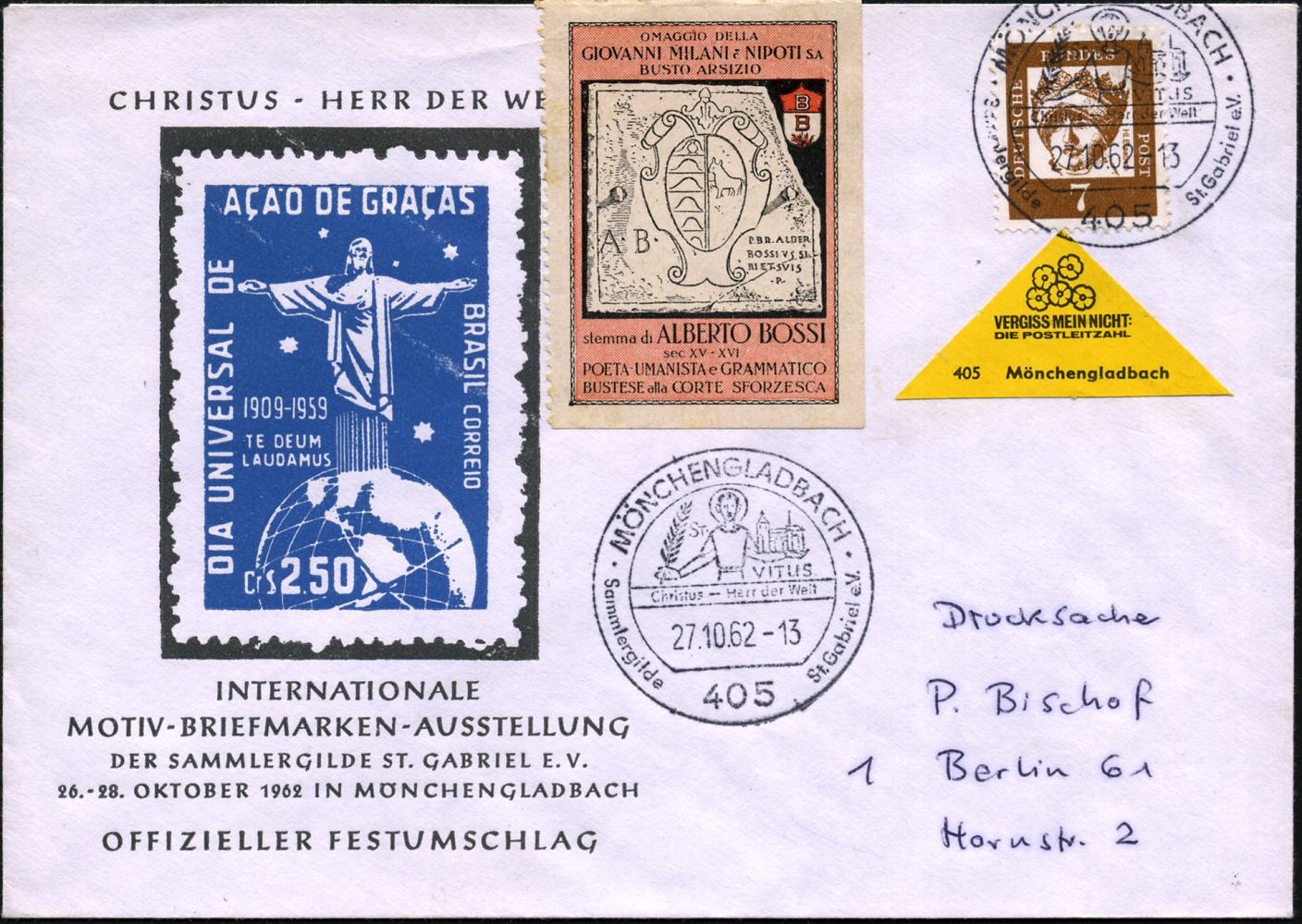 6753 | 18 € | 4050 Mönchengladbach : 405 MÖNCHENGLADBACH/ ST.VITUS/ Christus-Herr d.Welt.. 1962 (27.10.) SSt = St. Vitus + Ausstellungs-Vignette + postamtl. Label: 405 Mönchengladbach/VERGISS MEIN NICHT:/ DIE POSTLEITZAHL, motivgl. Ausst.-SU., seltene Kombination! (Bo.11) | ![]() | |