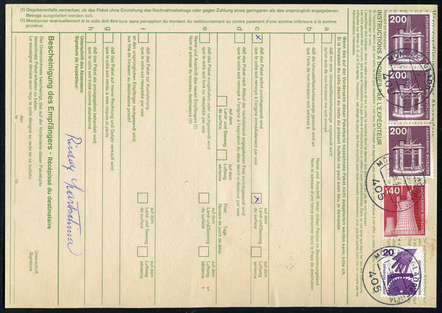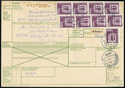 6757 | 16 € | 4050 Mönchengladbach : 405 MÖNCHENGLADBACH 14/ b 1976 (16.3.) 1K-Segment + brauner Paketzettel: 405 Mönchen-/gladbach 14 , 12x 200 Pf. Technik = Ölbohrinsel wie MeF (vs/rs. u.a.) = 2560 Pf.-Frankatur, Übersee-Paketkt. n. USA, seltene Portostufe! (Mi. 12x 858 etc.) | ![]() ![]() | |