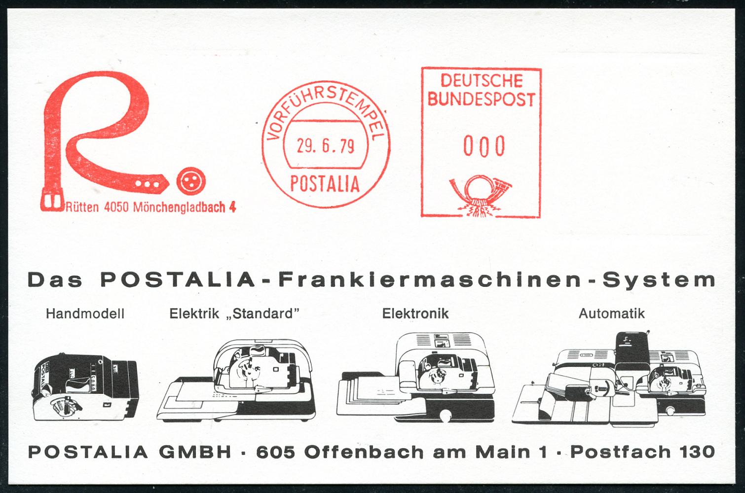 6759 | 18 € | 4050 Mönchengladbach : 4050 Mönchengladbach 4 1979 (29.6.) AFS: VORFÜHRSTEMPEL/POSTALIA/Rütten (Gürtel) seltene Postalia-Musterkarte! (= Specimen!) | ![]() | |