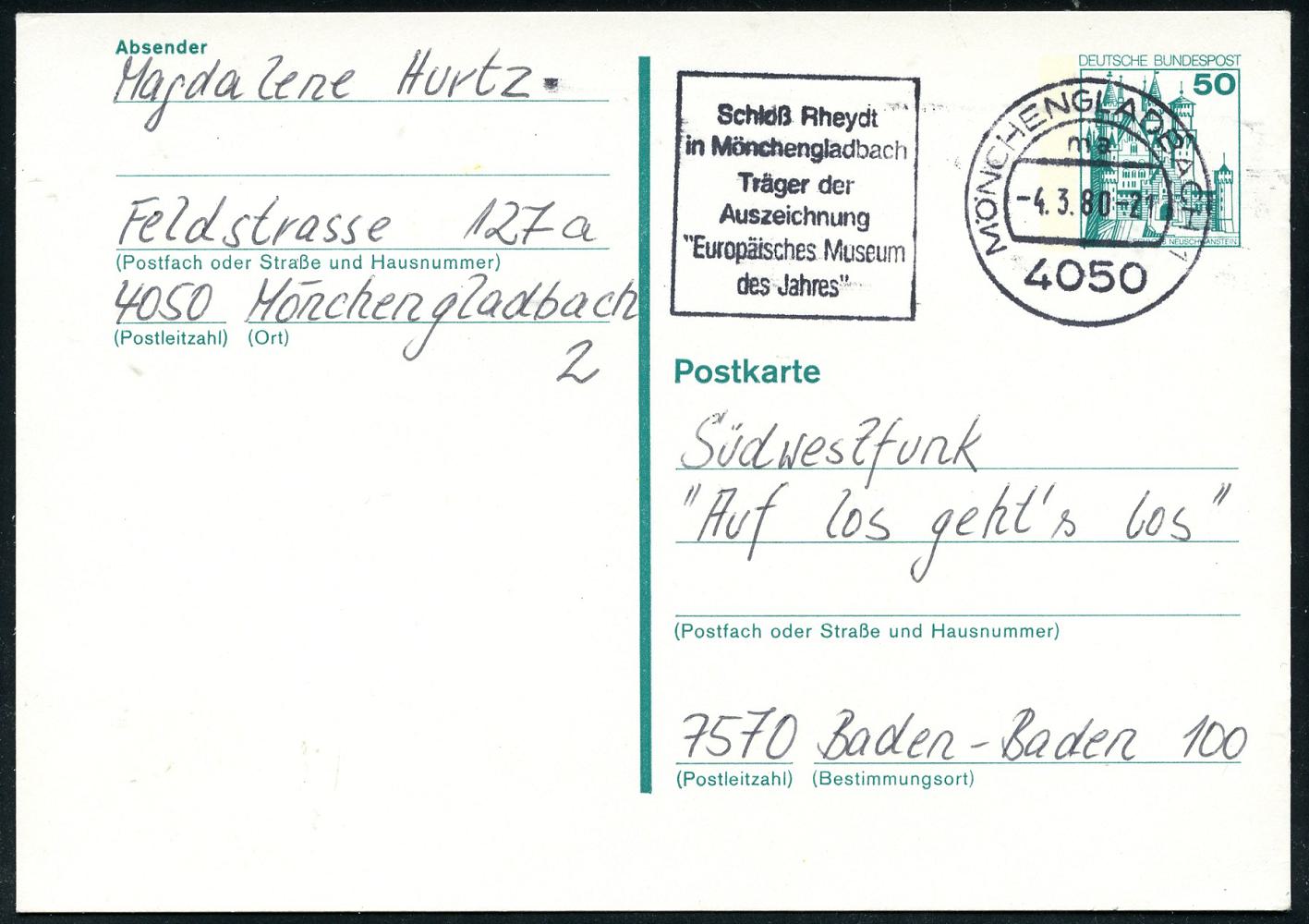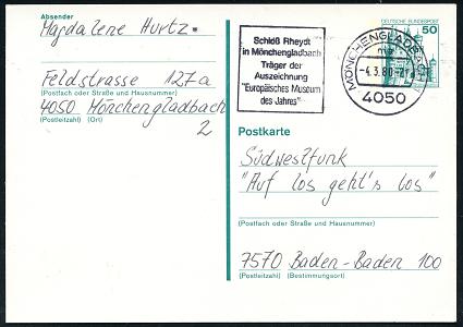 6760 | 8 € | 4050 Mönchengladbach : 4050 MÖNCHENGLADBACH 1/ ma/ Schloß Rheydt/ ..Träger der/ Auszeichnung/ "Europ.Museum/ des Jahres" 1980 (4.3.) MWSt auf Bedarfs-Kt. | ![]() | |