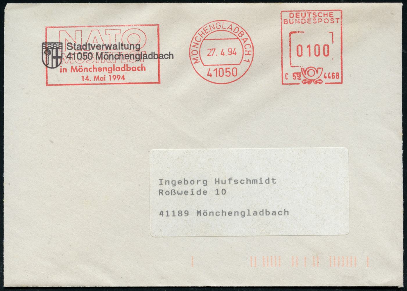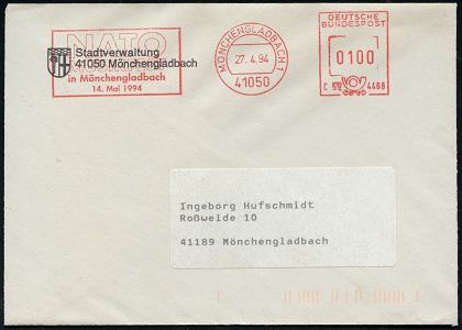 6764 | 8 € | 4050 Mönchengladbach : 41050 MÖNCHENGLADBACH 1/ C59 4468/ NATO/ MUSIKFEST.. 1994 (27.4.) AFS Francotyp mit Kennung auf Kommunal-Bf., nur einige Monate verwendet! | ![]() | |