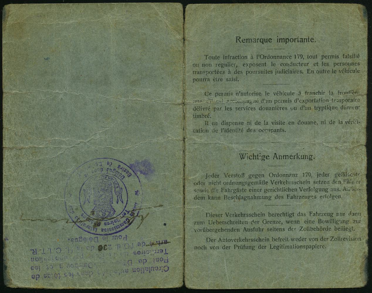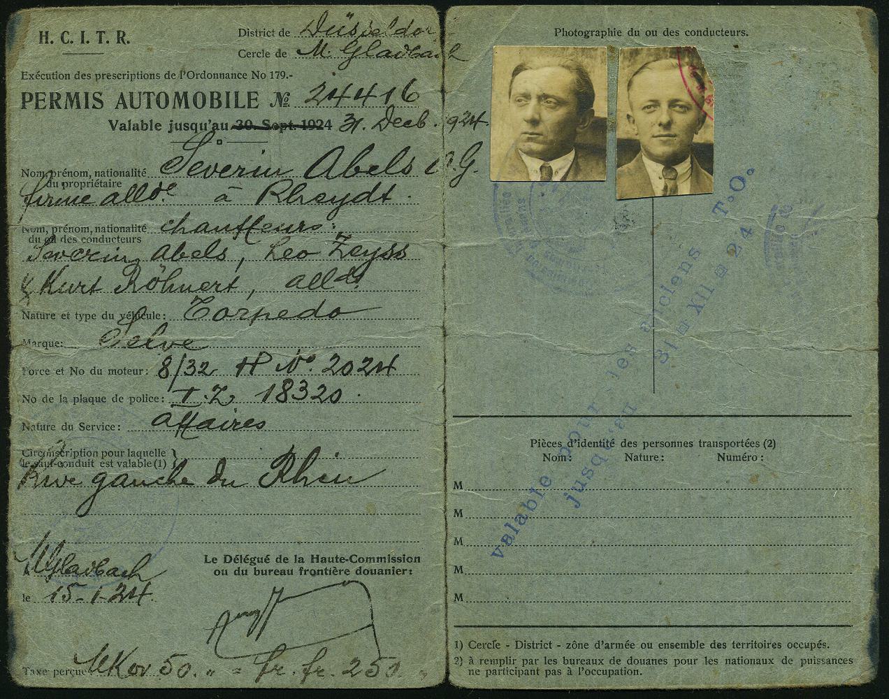 6711 | 25 € | 4050 Mönchengladbach : Mönchengladbach 1924 (15.1.) orig. Automobil-Fürerschein der französ. Besatzungsbehörde H.C.I.T.R. für einen "Selve Torpedo" (= Rheinland-Besetzung!) 2 verschied. Fotos (Ausweis auseinander getrennt) 1x Dienst-HdN der Interalliierten Commission.., seltenes Dokument! (wg. der Erhaltung günstiger Ausruf) | ![]() ![]() | |