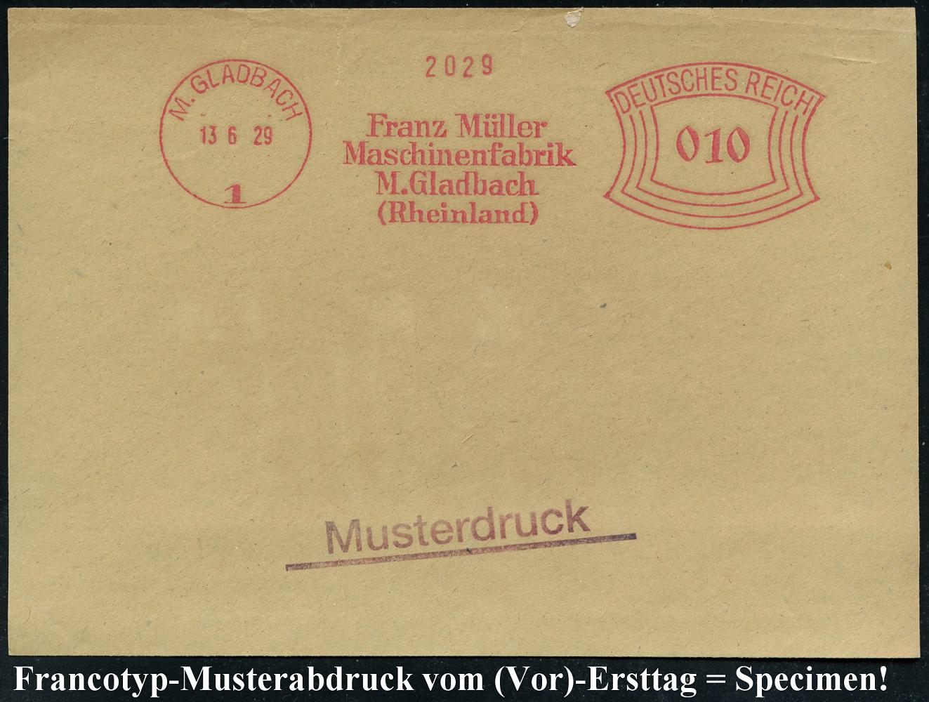6713 | 25 € | 4050 Mönchengladbach : M.GLADBACH/ 1/ Franz Müller/ Maschinenfabrik.. 1929 (13.6.) AFS-Musterabdruck Francotyp "Bogenrechteck" , glasklar gest. Francotyp-Musterblatt vom (Vor)-Ersttag! (2x kl. Riß geschl.), selten! (Dü.E-1CAh = frühe C-Maschine!) | ![]() ![]() | |