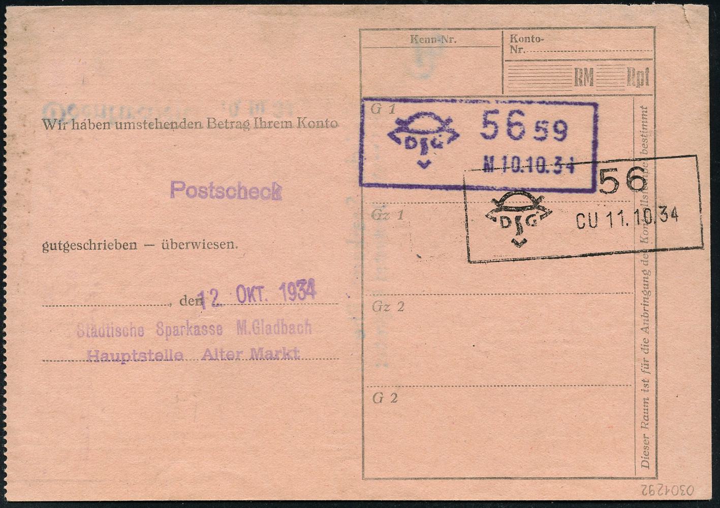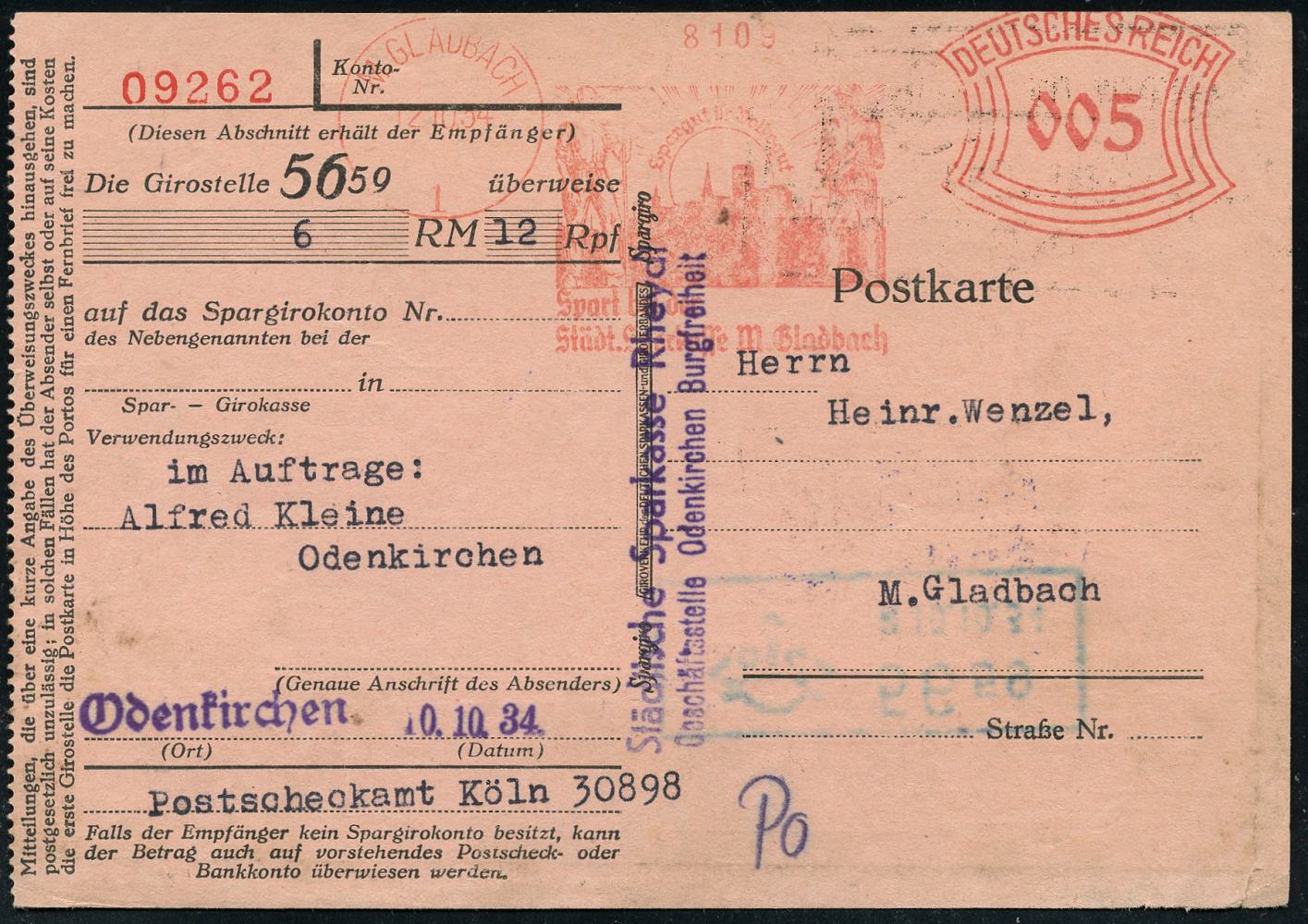 6716 | 25 € | 4050 Mönchengladbach : M.GLADBACH/ 1/ Spart bei der/ Städt.Sparkasse.. 1934 (2.10.) AFS Francotyp (Arbeiter, Bauer u. Stadtsilhouette) 005 Pf. auf rosa Postkarten-Scheck-Ortskarte, rs. 2 Sparkassen-HdN, seltene Verwendung! (Dü.E-1BAh) | ![]() ![]() | |