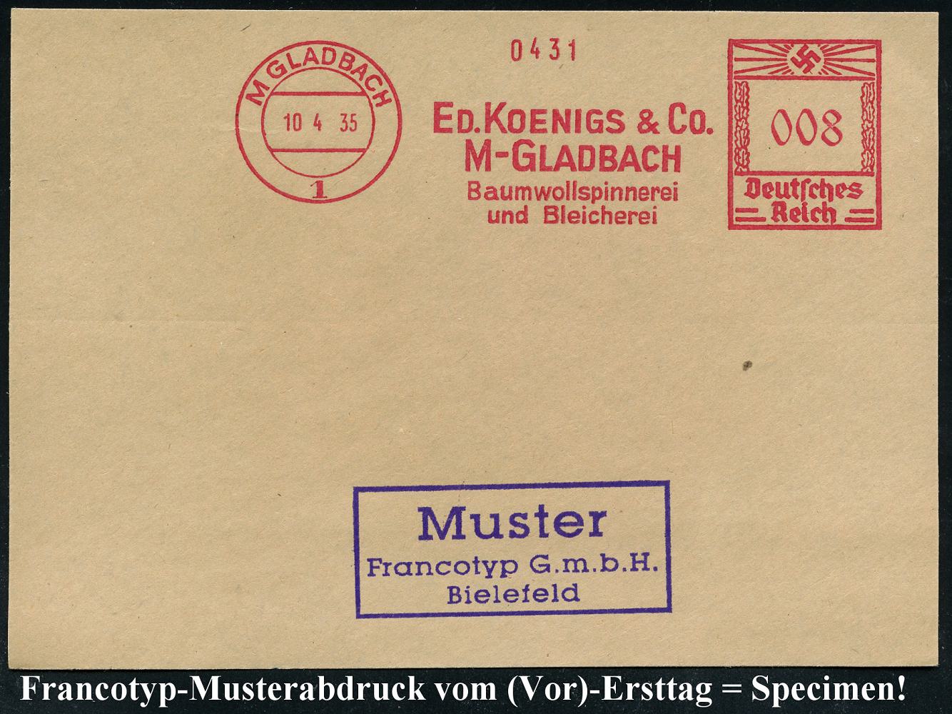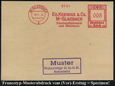 6720 | 35 € | 4050 Mönchengladbach : M.GLADBACH/ 1/ ED.KOENIGS & Co./ ..Baumwollspinnerei/ u.Bleicherei 1935 (10.4.) AFS-Musterabdruck Francotyp "Hakenkreuz" , glasklar gest. Francotyp-Musterblatt am (Vor)-Ersttag!, selten! (Dü.E-3CEh) | ![]() ![]() | |