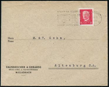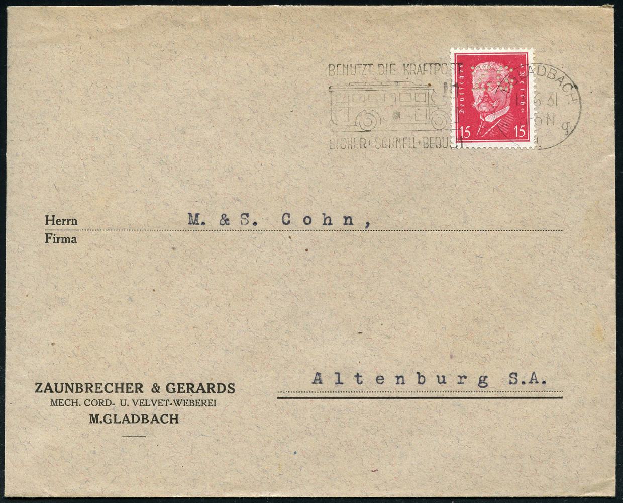 6714 | 16 € | 4050 Mönchengladbach : M.GLADBACH/ *1q/ BENUTZT DIE KRAFTPOST.. 1931 (13.6.) Serien-MWSt (Omnibus) auf EF 15 Pf. Hindenburg mit Firmenlochung: "Z G" = Zaunbrecher & Gerards Cord- u.Velvet-Werberei, (Mi.414 EF, Perfin) Firmen-Bf. (Bo.S 113 A) | ![]() | |