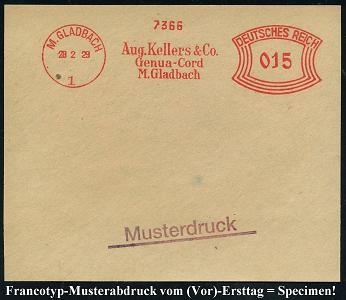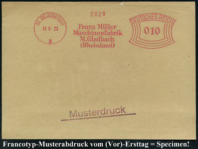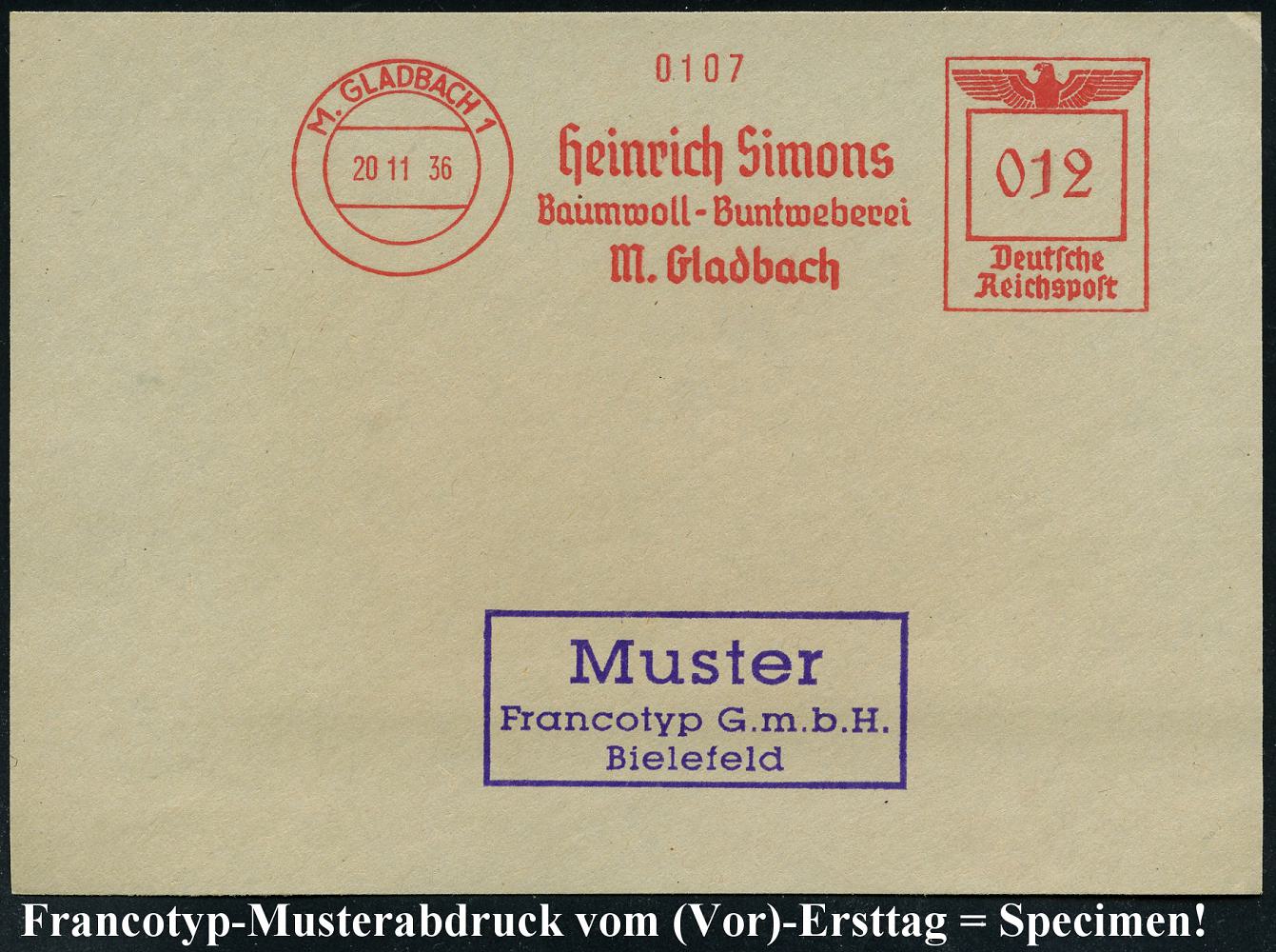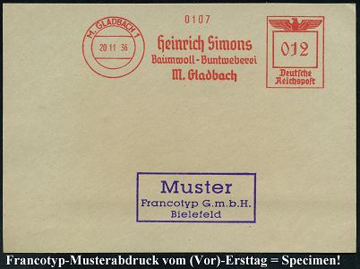 6725 | 35 € | 4050 Mönchengladbach : M.GLADBACH 1/ Heinrich Simons/ Baumwoll-Buntweberei.. 1936 (20.11.) AFS-Musterabdruck Francotyp "Reichsadler" (= jüdische Firma!) glasklar gest. Francotyp-Musterblatt vom (Vor)-Ersttag !, selten! (Dü.E-5CEh) | ![]() ![]() | |