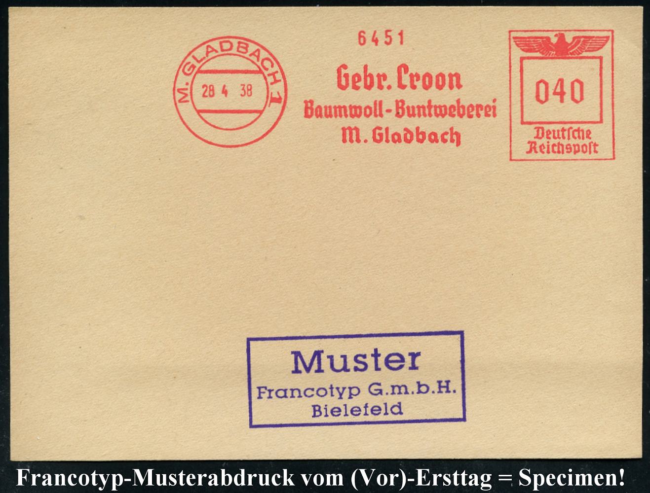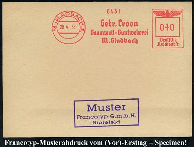 6736 | 35 € | 4050 Mönchengladbach : M.GLADBACH 1/ Gebr.Croon/ Baumwoll-Buntweberei.. 1938 (28.4.) AFS-Musterabdruck Francotyp "Reichsadler" , glasklar gest. Francotyp-Musterblatt vom (Vor)-Ersttag!, selten! (Dü.E-5CGh) | ![]() ![]() | |