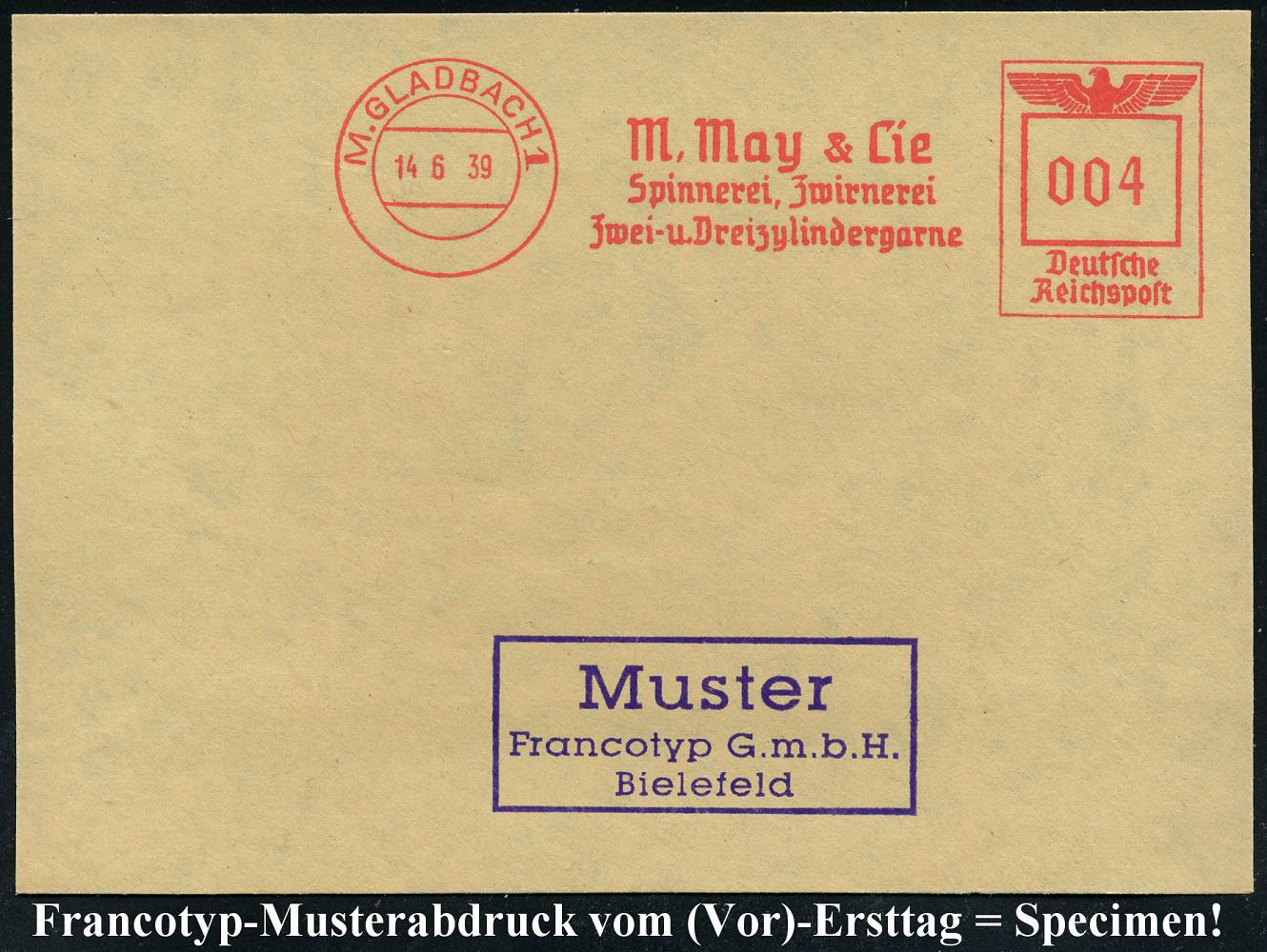 6742 | 35 € | 4050 Mönchengladbach : M.GLADBACH 1/ M.May & Cie/ Spinnerei,Zwirnerei/ Zwei-u.Dreizylindergarne 1939 (14.6.) AFS-Musterabdruck Francotyp "Reichsadler" , glasklar gest. Francotyp-Musterblatt vom (Vor)-Ersttag !, selten! (Dü.E-5CGo) | ![]() ![]() | |