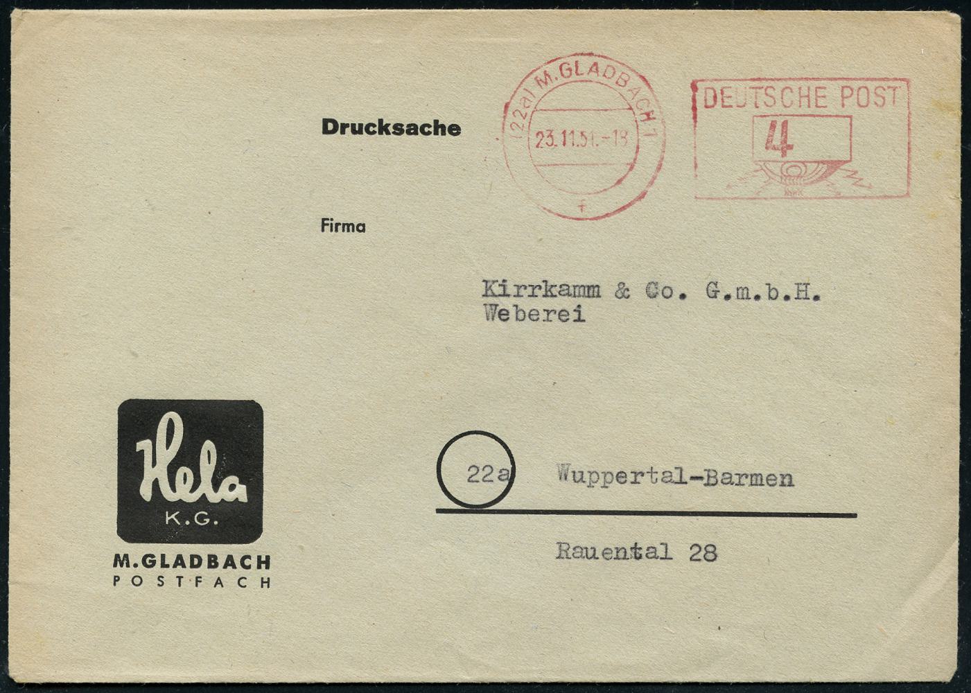 6747 | 12 € | 4050 Mönchengladbach : (22a) M.GLADBACH 1/ f/ DEUTSCHE POST 1951 (23.11.) PFS Querrechteck "Posthorn" 4 Pf. auf Firmen-Bf.: Hela KG.. (Dü.D-15, Nr.269) | ![]() | |