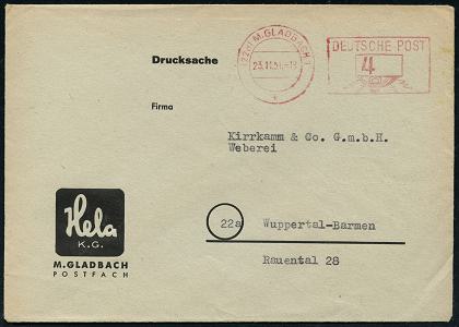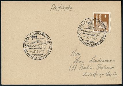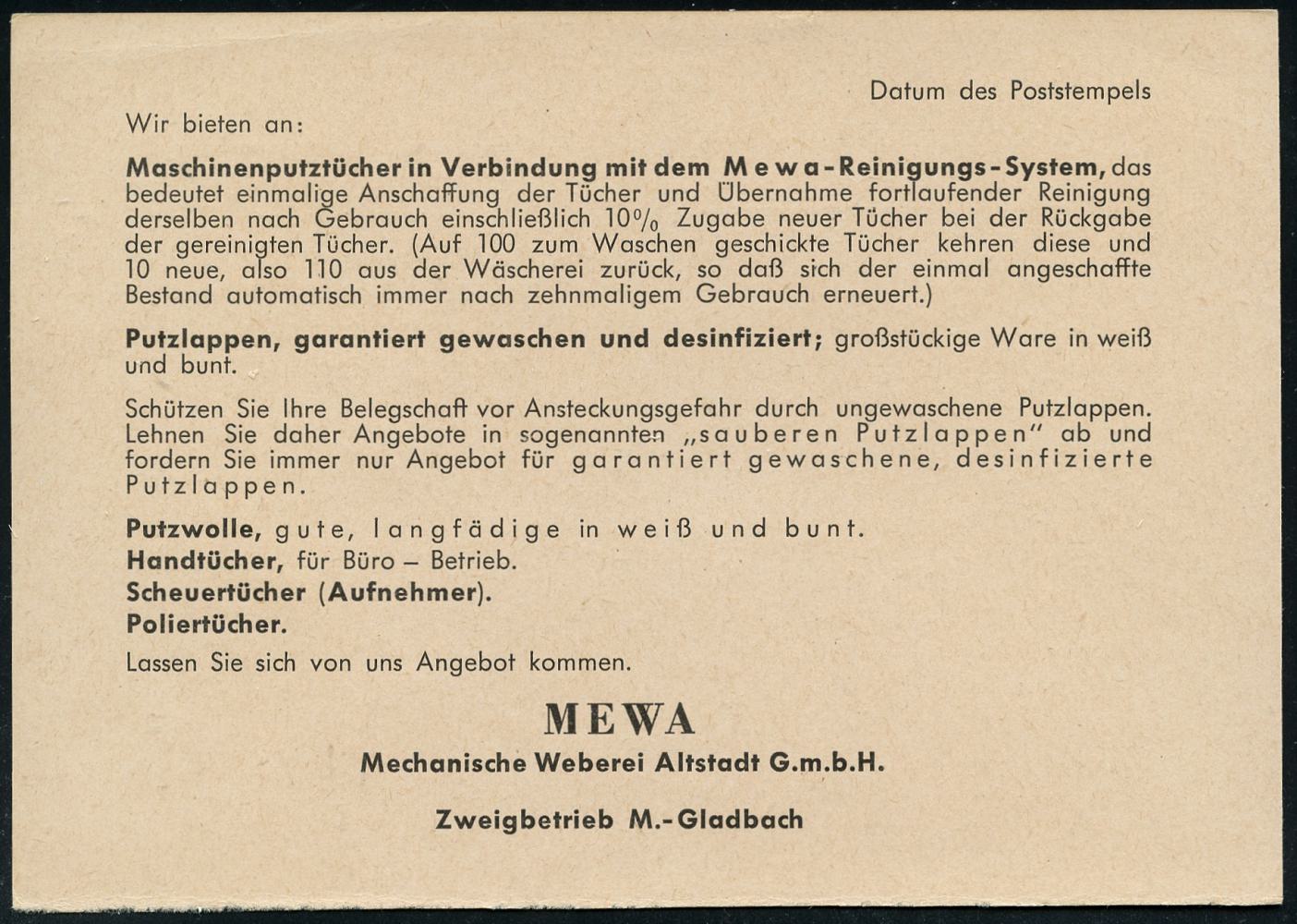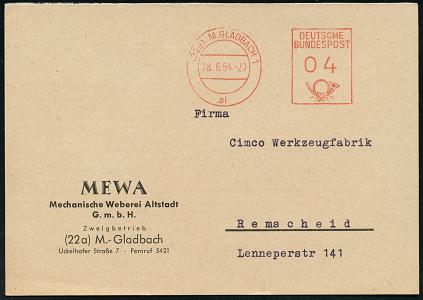 6748 | 12 € | 4050 Mönchengladbach : (22a) M.GLADBACH 1/ ai/ DEUTSCHE/ BUNDESPOST 1954 (28.6.) PFS Hochrechteck "Posthorn" 04 Pf. auf Firmen-Reklame-Kt.: MEWA, Mechanische Weberei Altstadt GmbH.. für Putztücher (Dü.D-17, alte PLZ) | ![]() ![]() | |