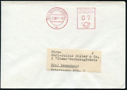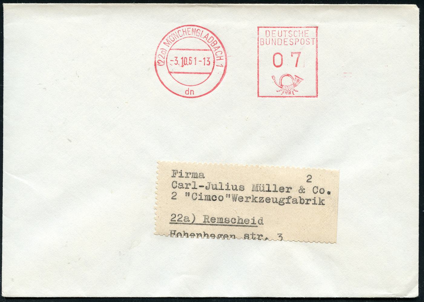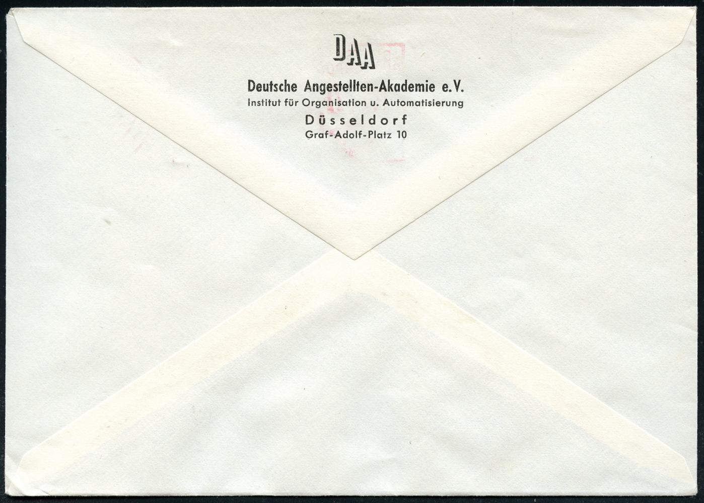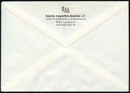 6752 | 14 € | 4050 Mönchengladbach : (22a) MÖNCHENGLADBACH 1/ dn/ DEUTSCHE/ BUNDESPOST 1961 (3.10.) PFS Hochrechteck "Posthorn" auf Inl.-Drs.-Bf., rs. Abs.: DAA, Deutsche Angestellten-Akademie e.V., Institut für Organisation u. Automatisierung (Dü.D-17, Letztjahr alte PLZ) | ![]() ![]() | |
