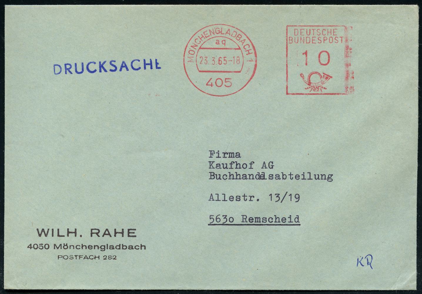 6755 | 8 € | 4050 Mönchengladbach : 405 MÖNCHENGLADBACH 1/ aq/ DEUTSCHE/ BUNDESPOST 1965 (23.3.) PFS Hochrechteck "Posthorn" 10 Pf. auf Firmen-Bf.: WILH. RAHE.. (Dü.D-17, neue PLZ) | ![]() | |