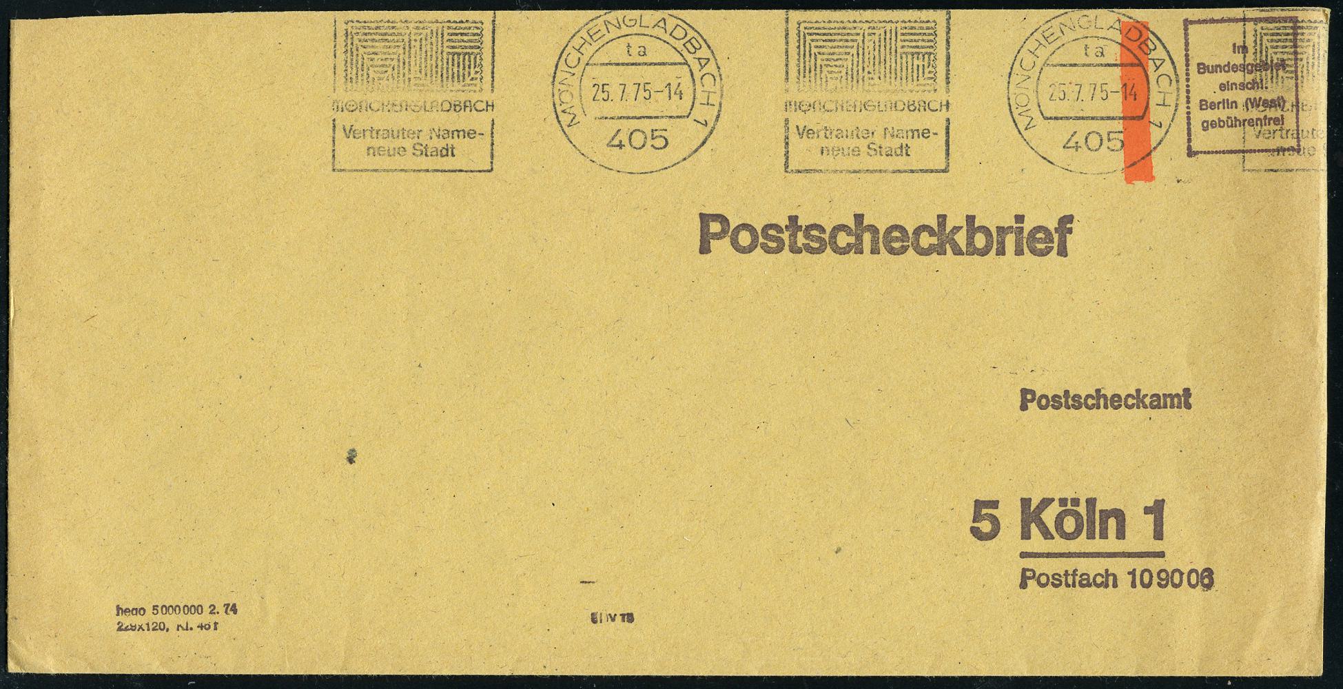 6756 | 18 € | 4050 Mönchengladbach : 405 MÖNCHENGLADBACH 1/ ta/ Vertrauter Name-/ neue Stadt 1975 (25.7.) Band-MaWSt auf Postscheck-Innendienst-Bf.: PSchAmt 5 Köln 1 mit orange Lumo-Balken!, seltener Beleg! (= Post-Automation!) | ![]() | |