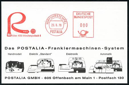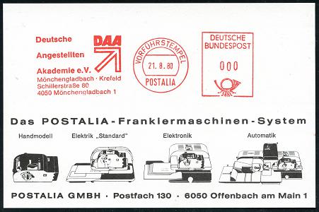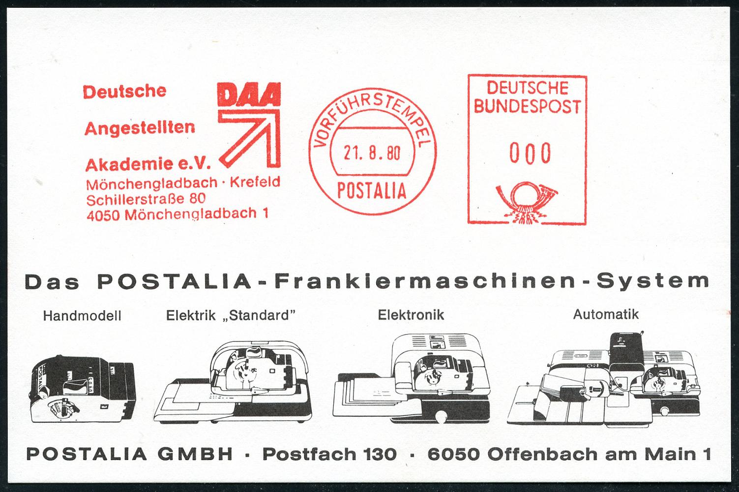 6761 | 18 € | 4050 Mönchengladbach : 4050 Mönchengladbach 1 1980 (21.8.) AFS: VORFÜHRSTEMPEL/POSTALIA/DAA/Deutsche/Angestellten/Akademie e.V... (Logo) seltene Postalia-Muster-Kt., vergl. Kat.-Nr.6752 (= Specimen!) | ![]() | |