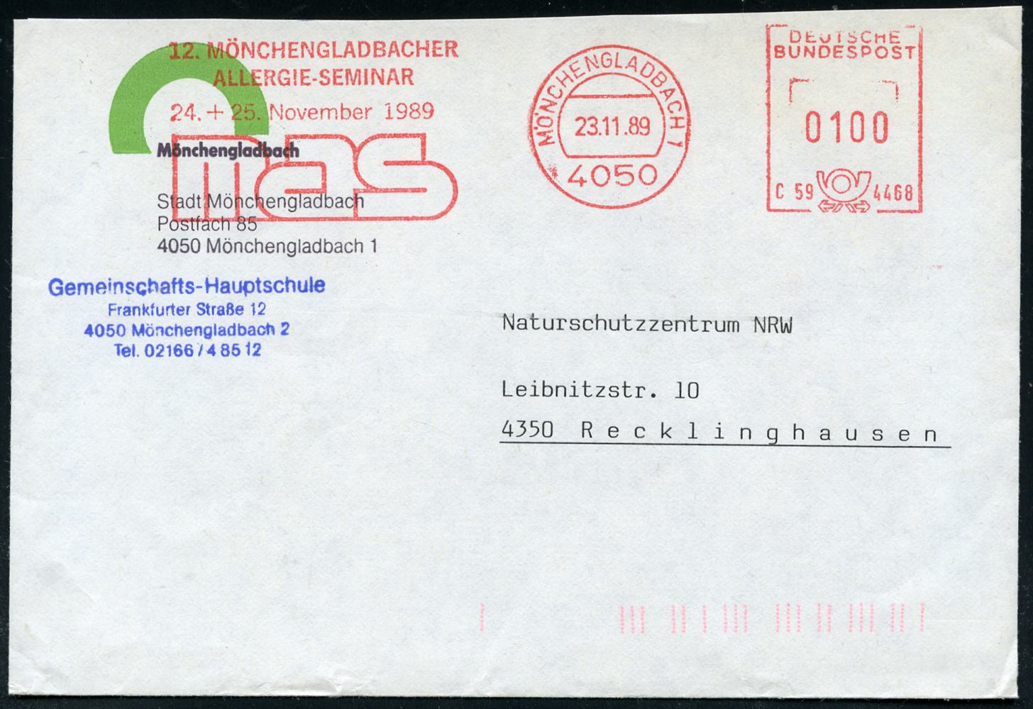 6763 | 15 € | 4050 Mönchengladbach : 4050 MÖNCHENGLADBACH 1/ 12.MÖNCHENGLADBACHER/ ALLERGIE-SEMINAR../ MaS 1989 (23.11.) seltener AFS Francotyp mit Kennung (Monog.-Logo) zweifarbiger Kommunal-Bf. (Abs.: Hauptschule) + rosa Linear-Codierung | ![]() | |