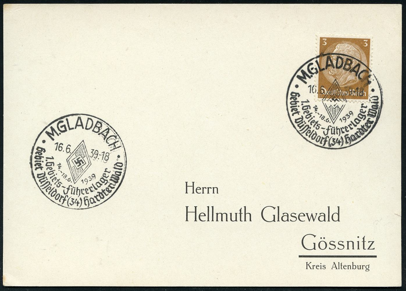 6741 | 16 € | 4050 Mönchengladbach : M.GLADBACH/ 1.Gebiets-Führerlager/ Gebiet Düsseldorf (34) Hardter Wald 1939 (16.6.) SSt (HJ-Logo) klar gest. Inl.-Drs.-Karte (Bo.2) | ![]() | |