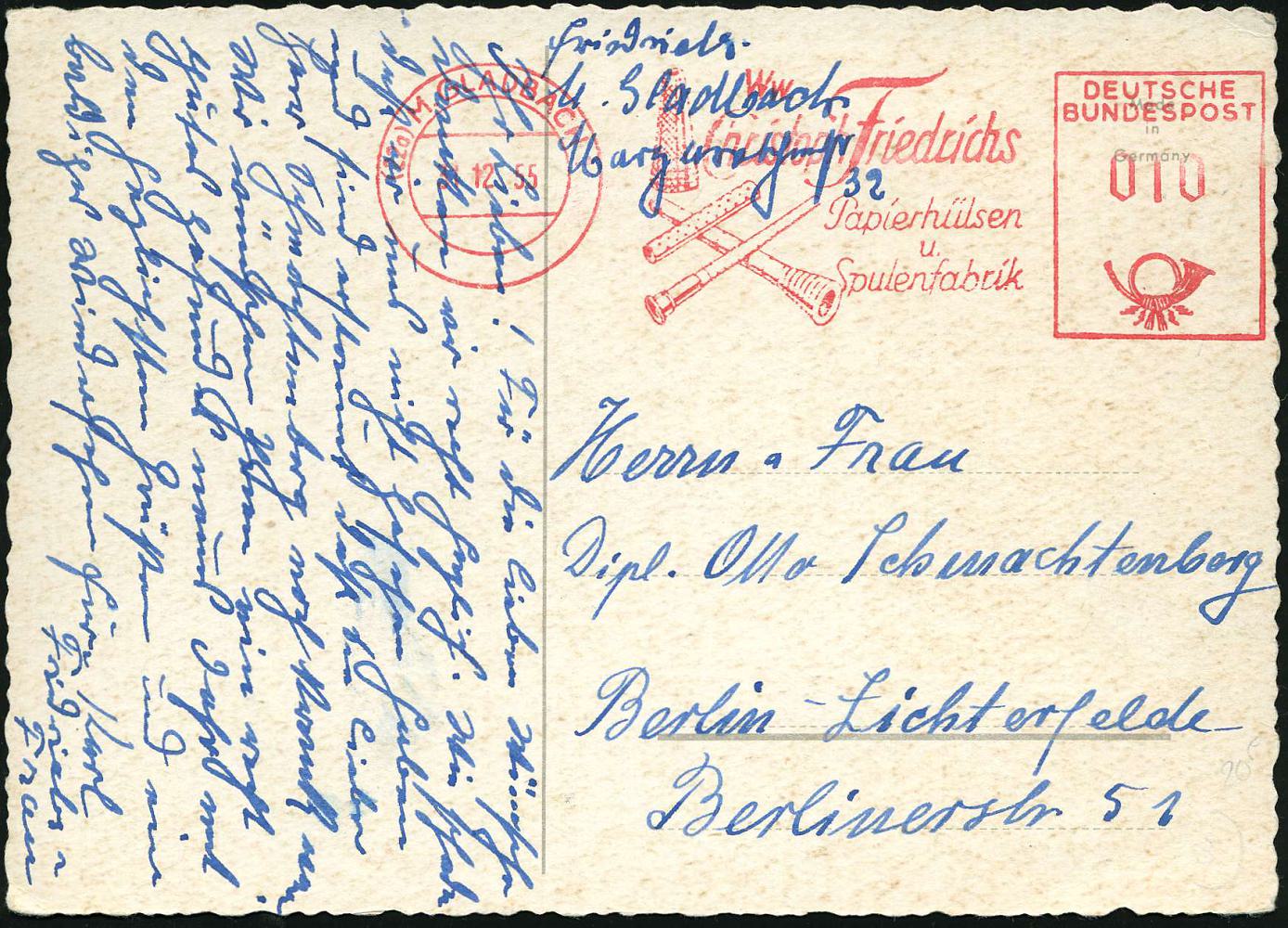 6749 | 16 € | 4050 Mönchengladbach : (22a) M.GLADBACH/ Christoph Friedrichs/ Papierhülsen/ u./ Spulenfabrik 1955 (31.12.) dekorativer AFS Francotyp 010 Pf. (div.Papierhülsen u.-Filter) auf privater Neujahrs-Ak. des Inhabers!, seltene Verwendung! (Dü.E-23CG) | ![]() ![]() | |