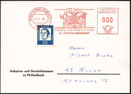 6754 | 18 € | 4050 Mönchengladbach : 405 MÖNCHENGLADBACH 1/ 125 Jahre/ Industrie-u.Handelskammer 1963 (25.4.) AFS Francotyp in 000 als Vorausentwertung auf EF 15 Pf.Luther , portorichtige Dienst-Kt.: Industrie-u.Handelskammer (Mi.351x / EF VE) | ![]() | |