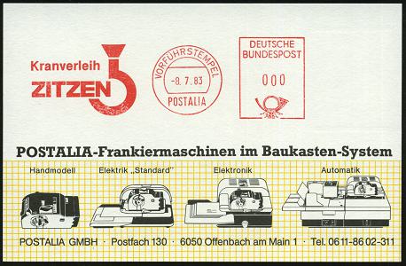 6762 | 18 € | 4050 Mönchengladbach : Mönchengladbach 1983 (8.7.) AFS.: VORFÜHRSTEMPEL/POSTALIA/Kranverleih/ZITZEN = Kranhaken , seltene Postalia-Musterkt.! (= Specimen!) | ![]() | |
