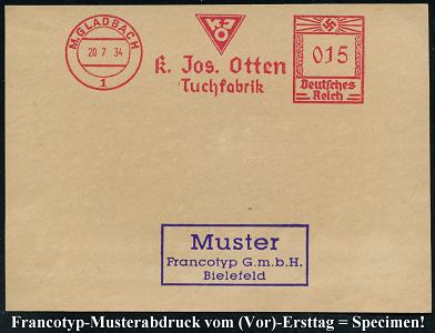 6715 | 35 € | 4050 Mönchengladbach : M.GLADBACH/ 1/ K.Jos.Otten/ Tuchfabrik 1934 (20,7,) AFS-Musterabdruck Francotyp "Hakenkreuz" (Firmen-Logo) glasklar gest. Francotyp-Musterblatt vom (Vor)-Ersttag!, selten! (Dü.E-3CEo) | ![]() ![]() | |