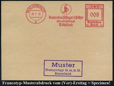 6717 | 35 € | 4050 Mönchengladbach : M.GLADBACH/ 1/ Buntweberei Fellinger & Petzer/ AG.. 1935 (22.1.) AFS-Musterabdruck Francotyp "Hakenkreuz" (Monogr.-Logo) glasklar gest. Francotyp-Musterblatt vom (Vor)-Ersttag!, selten! (Dü.E-3CEo) | ![]() ![]() | |