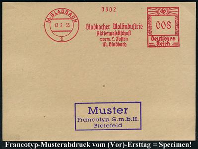 6718 | 35 € | 4050 Mönchengladbach : M.GLADBACH/ 1/ Gladbacher Wollindustrie/ AG/ vorm.L.Josten.. 1935 (13.2.) AFS-Musterabdruck Francotyp "Hakenkreuz" , glasklar gest. Francotyp-Musterblatt vom (Vor)-Ersttag!, selten! (Dü.E-3CEh) | ![]() ![]() | |