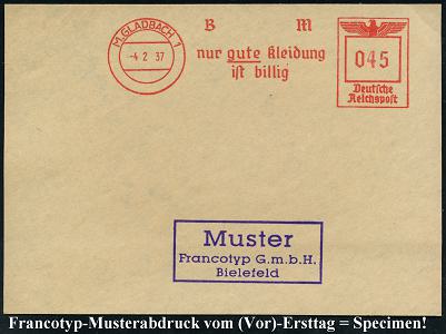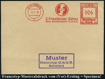 6719 | 35 € | 4050 Mönchengladbach : M.GLADBACH/ 1/ S.Friedländer Söhne/ Mech.Kleiderfabrik GmbH 1935 (5.3.) AFS-Musterabdruck Francotyp "Hakenkreuz" (Monogr.-Logo = jüdische Firma!) glasklar gest. Francotyp-Musterblatt vom (Vor)-Ersttag!, selten! (Dü.E-3CEo) | ![]() ![]() | |