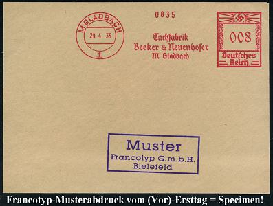 6721 | 35 € | 4050 Mönchengladbach : M.GLADBACH/ 1/ Tuchfabrik/ Becker & Neuenhofer.. 1935 (29.4.) AFS-Musterabdruck Francotyp "Hakenkreuz" , glasklar gest. Francotyp-Musterblatt vom (Vor)-Ersttag!, selten! (Dü.E-3CEh) | ![]() ![]() | |