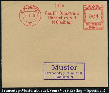 6722 | 35 € | 4050 Mönchengladbach : M.GLADBACH/ 1/ Ges.für Druckerei u./ Färberei m.b.H... 1935 (1.8.) AFS-Musterabdruck Francotyp "Hakenkreuz" , glasklar gest. Francotyp-Musterblatt vom (Vor)-Ersttag!, selten! (Dü.E-3CEh) | ![]() ![]() | |