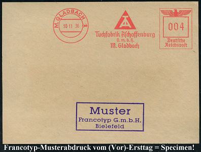 6724 | 35 € | 4050 Mönchengladbach : M.GLADBACH 1/ Tuchfabrik Aschaffenburg/ GmbH.. 1936 (10.11.) AFS-Musterabdruck Francotyp "Reichsadler" (Monogr.-Logo) glasklar gest. Francotyp-Musterblatt vom (Vor)-Ersttag!, selten! (Dü.E-5CGo) | ![]() ![]() | |