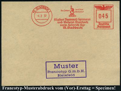 6726 | 35 € | 4050 Mönchengladbach : M.GLADBACH 1/ ..Allgäuer Baumwoll-Spinnerei/ u.Weberei Blaichach/ vorm.Heinrich Gyr.. 1937 (4.2.) AFS-Musterabdruck Francotyp "Reichsadler" (Monogr.-Logo) glasklar gest. Francotyp-Musterblatt vom (Vor)-Ersttag!, selten! (Dü.E-5CGo) | ![]() ![]() | |