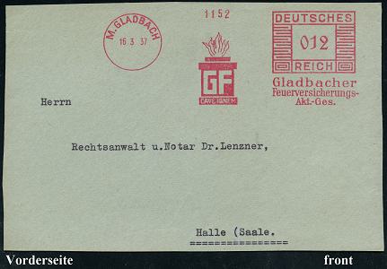 6728 | 16 € | 4050 Mönchengladbach : M.GLADBACH/ GF/ CAVE IGNEM/ Gladbacher/ Feuerversicherungs/ AG 1937 (16.3.) AFS Francotyp "Mäanderrechteck" (Logo: Flammenaltar, latein. Motto: Vorsicht vor dem Feuer) Bedarfs-Vorderseite (Dü.E-2CEh) | ![]() | |