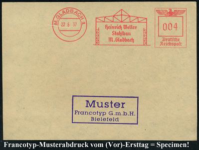 6730 | 35 € | 4050 Mönchengladbach : M.GLADBACH 1/ Heinrich Weller/ Stahlbau.. 1937 (22.5.) AFS-Musterabdruck Francotyp "Reichsadler" (Stahlgerüst einer Halle) glasklar gest. Francotyp-Musterblatt vom (Vor)-Ersttag!, selten! (Dü.E-5CGo) | ![]() ![]() | |