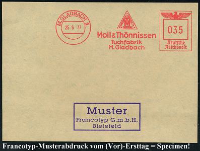 6731 | 35 € | 4050 Mönchengladbach : M.GLADBACH 1/ Moll & Thönnissen/ Tuchfabrik.. 1937 (25.6.) AFS-Musterabdruck Francotyp "Reichsadler" (Monogr.-Lodo) glasklar gest. Francotyp-Musterblatt vom (Vor)-Ersttag !, selten! (Dü.E-5CGo) | ![]() ![]() | |
