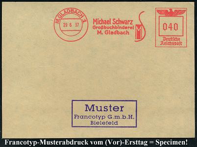 6732 | 35 € | 4050 Mönchengladbach : M.GLADBACH 1/ Michael Schwarz/ Großbuchbinderei.. 1937 (29.6.) AFS-Musterabdruck Francotyp "Reichsadler" (Monogr.-Logo) glasklar gest. Francotyp-Musterblatt vom (Vor)-Ersttag!, selten! (Dü.E-5CGo) | ![]() ![]() | |
