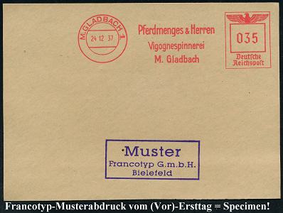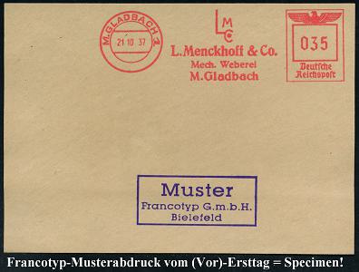 6733 | 35 € | 4050 Mönchengladbach : M.GLADBACH 1/ L.Menckenhoff & Co./ Mech.Weberei.. 1937 (21.10.) AFS-Musterabdruck Francotyp "Reichsadler" (Monogr.-Logo) glasklar gest. Francotyp-Musterblatt vom (Vor)-Ersttag !, selten! (Dü.E-5CGo) | ![]() ![]() | |